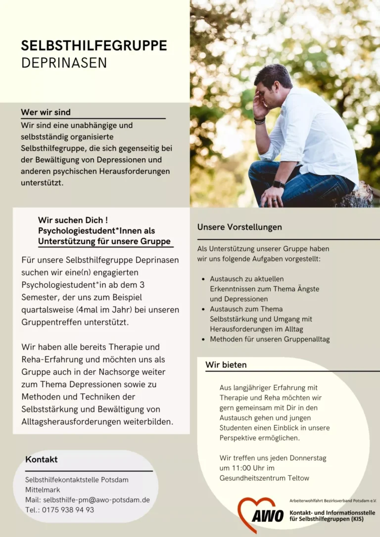 Die Deprinasen sind eine unabhängige undselbstständig organisierteSelbsthilfegruppe, die sich gegenseitig beider Bewältigung von Depressionen undanderen psychischen Herausforderungenunterstützt. Wir suchen wir eine(n) engagierten Psychologiestudierenden ab dem 3. Semester, der uns zum