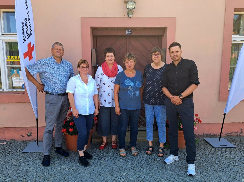 Der Beeskower Kämmerer Steffen Schulze, die Leiterin der DRK-Geschäftsstelle Eisenhüttenstadt, Daniela Koch, Marion Brunnert von der Landesarbeitsgemeinschaft der Selbsthilfekontaktstellen Brandenburg e.V., Helfer*innenkreis-Koordinatorin Cornelia Ewert, Ramona Weinert von der Selbsthilfe-Kontaktstelle und der Beeskower Bürgermeister Robert Czaplinski (v. l.) vor dem neuen Sitz von Selbsthilfe-Kontaktstelle und Helfer*innenkreis in der Breitscheidstraße 12